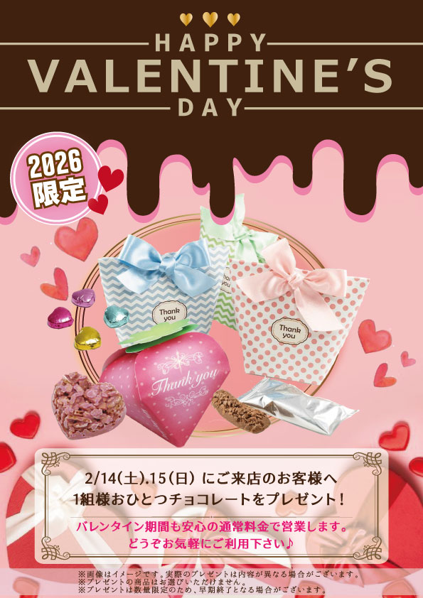 | 2026.1/29★数量限定 バレンタインプレゼント★ 2/14(土).15(日)にご来店のお客様へチョコレートのプチギフトをプレゼント! バレンタイン期間も安心の通常料金にて営業致します♪ ご来店お待ちしております☆彡 |